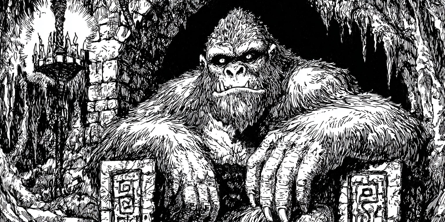 The King of the Apes functions best as a dynamic boss encounter that can veer between horror, spectacle, and unexpected empathy. His temperament is mercurial and he lacks patience: he may charge the party with wild fury if upset, or pause to observe their actions if they find a way to amuse him. His attacks strike entire areas with seismic force, and his roar is strong enough to shake the confidence of even the most hardened warriors. Non-violent approaches that appeal to his curiosity, such as offerings of distracting objects or clever displays of deference might stay his hand. As a spectacle, the King can create shockwaves with his temper tantrums or shrug off massive damage with his aura of power. When running this monster, remember that despite his melee size, his legendary ability to savage the environment effects siege: cliffs, trees, or crumbling ruins can all be objects of his rage. PCs who choose to exploit his phobia of fire may be in for a surprise when his response is to swallow them whole.