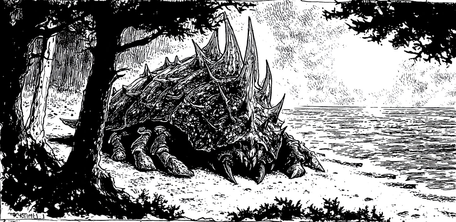 It crawls into view with unsettling grace, a carapaced beast from a time before time—its limbs clicking rhythmically, its eyes (if it has any at all) glinting with a dim but murderous awareness.
