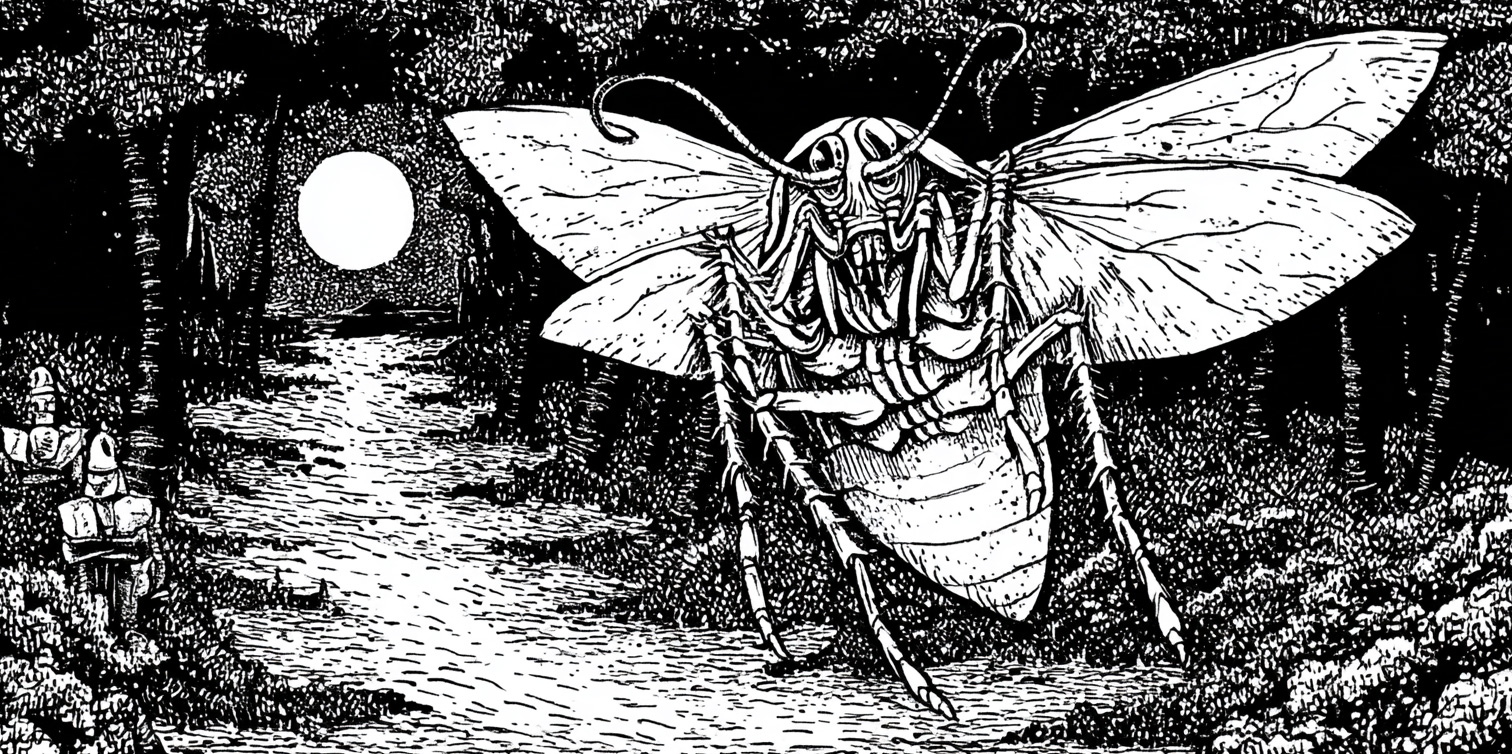 A single specimen is the size of a pony and lives in subterranean colonies by the hundreds or thousands. While these monstrous creatures are scavengers that feed primarily on carrion and refuse, they won’t turn up the opportunity to eat a living meal. They have glossy carapace as thick as heavy armor and use their antennae and compound eyes to see in the dark. Dire Cockroaches are clumsy fliers; they are more likely to leap short distances than fly at length. Their mandibles drip with a fetid slime that causes disease, and due to their uncanny resilience, they can rise from the dead until their vital organs are fully dismembered. Dire Cockroaches thrive on filth, persisting where other creatures perish, such as ruined cities and fresh battlefields.